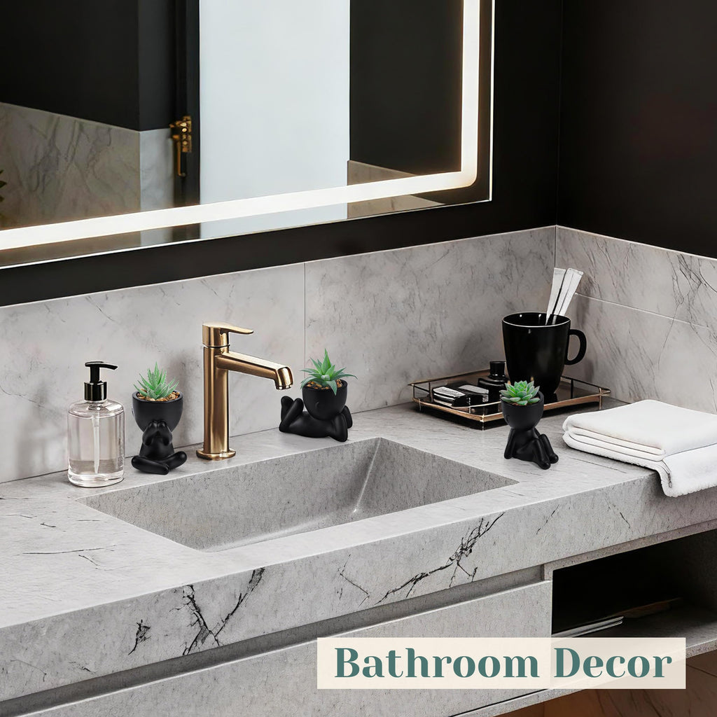 Dimensions and setup: individual heights reach up to 5.1 inches and widths up to 4.3 inches. Color is black. No watering or soil is required, making maintenance minimal. These three pieces are suitable for desks, shelves, bathrooms, or bedrooms.