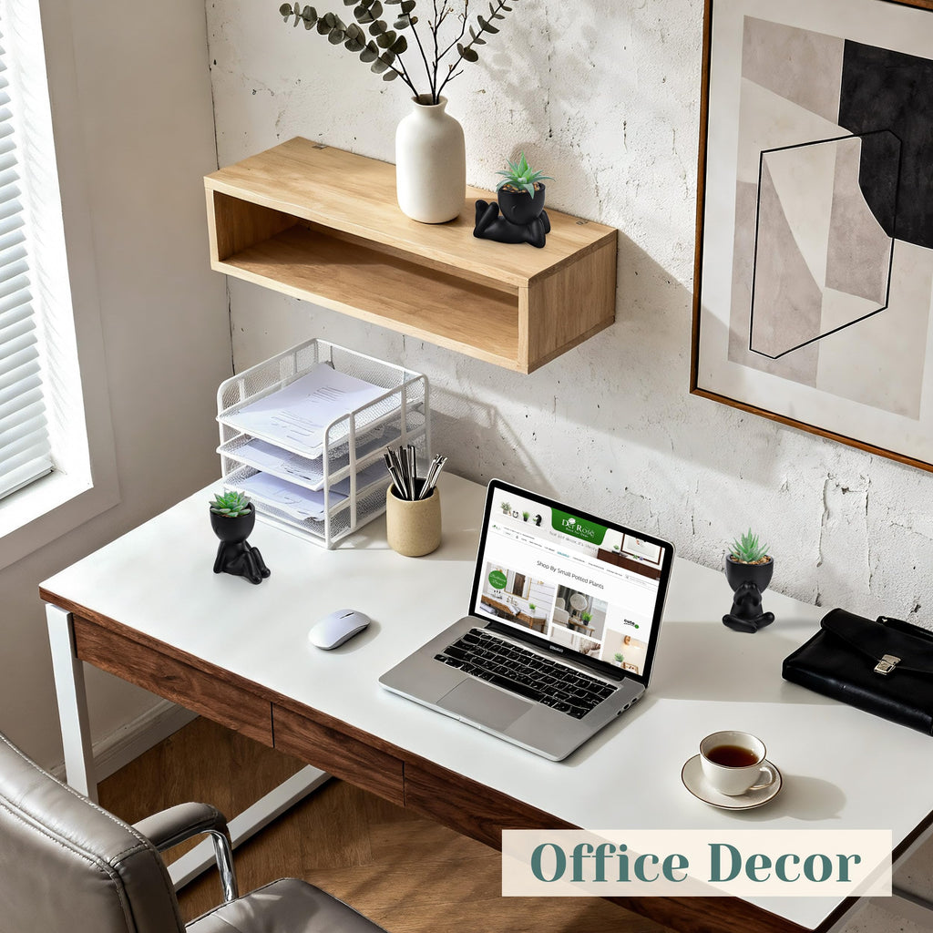 Der Rose 3-piece artificial succulent set includes three black pots with human-shaped silhouettes. The desk plants feature a flocked coating to add texture and realism. Made from high-quality plastic, the faux succulents are durable, tasteless, and designed for indoor use.